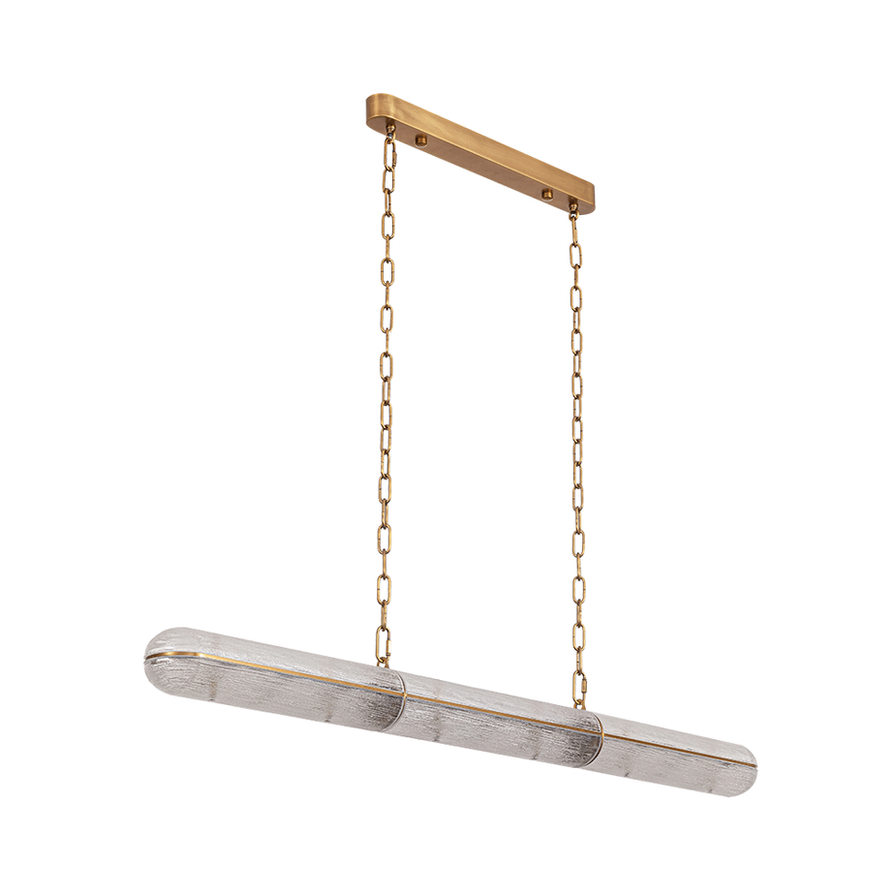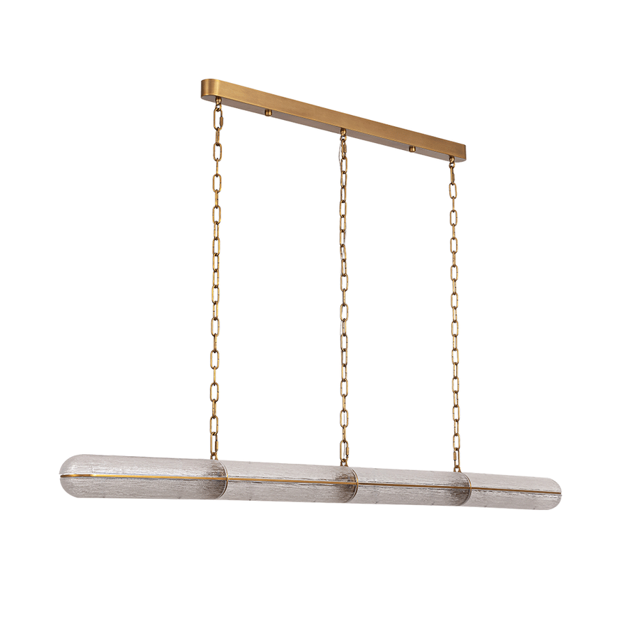 Luminária pendente em vidro com sustentação em aço e acabamento na cor ouro velho. Cabos em aço com extensão de até 180 cm. Voltagem bivolt (110/220V).