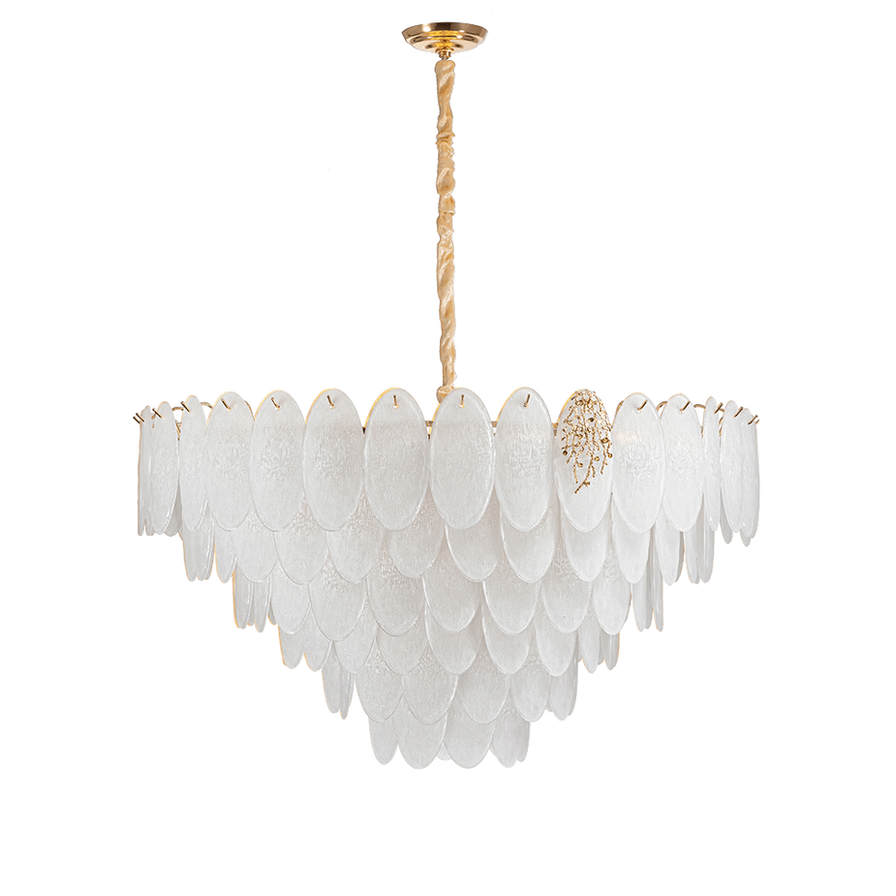 Lustre em aço inoxidável com acabamento ouro velho, cúpulas em vidro alabastro e detalhes metálicos aplicados na canopla e nas correntes. Voltagem bivolt (110/220V). Disponível em quatro tamanhos com variação no número de lâmpadas.